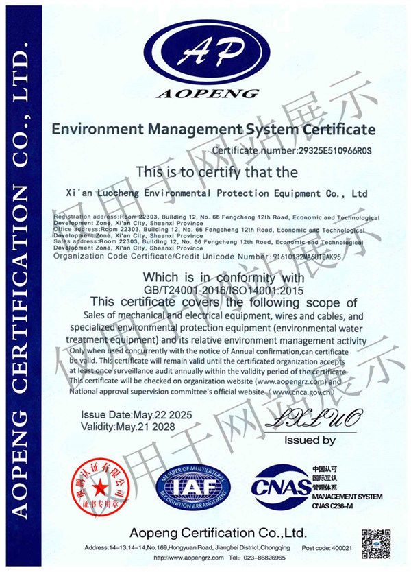 環(huán)境管理體系認(rèn) 證證書