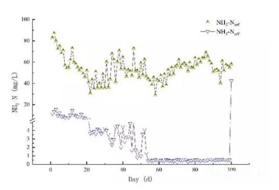 調(diào)試初期,生化系統(tǒng)已遭受進水沖擊,進水COD和氨氮遠超設(shè)計值,出水嚴重波動。系統(tǒng)恢復(fù)后,水質(zhì)波動仍然存在,進水氨氮最大值為72.00mg/L、最小值為35.00mg/L、均值為53.30mg/L,超出設(shè)計值,但出水水質(zhì)已經(jīng)達標,并且隨著填料上生物膜的成熟,出水氨氮降低到1.00mg/L以下,生化系統(tǒng)對氨氮的去除效果如圖3所示。對比系統(tǒng)恢復(fù)后(22-52d)和生物膜成熟后(52-100d)的氨氮數(shù)據(jù),生物池出水氨氮均值分別為4.20mg/L和0.50mg/L,去除率分別為92.12%和99.06%。這主要是兩方面的原因,一方面是隨著懸浮填料的投加,容易使污泥齡較長的硝化菌在填料表面大量生長,增強了系統(tǒng)的硝化能力,另一方面是隨著硝化反應(yīng)的進一步加強,回流的硝態(tài)氮濃度的升高,在缺氧區(qū)發(fā)生的反硝化反應(yīng)消耗了更多的碳源,降低了好氧區(qū)的COD負荷,促進了硝化反應(yīng)的進行。對于沖擊,實質(zhì)上是有機物超過設(shè)計值進入了好氧區(qū),擠占了懸浮態(tài)污泥中硝化菌群的代謝和增殖空間,使之在污泥中占比不足,難以達到預(yù)期效果;而懸浮載體的加入,盡管仍存在水質(zhì)沖擊,但可提供空間讓硝化菌群逐步富集,系統(tǒng)的抗沖擊能力提升,系統(tǒng)處理效果逐步改善。